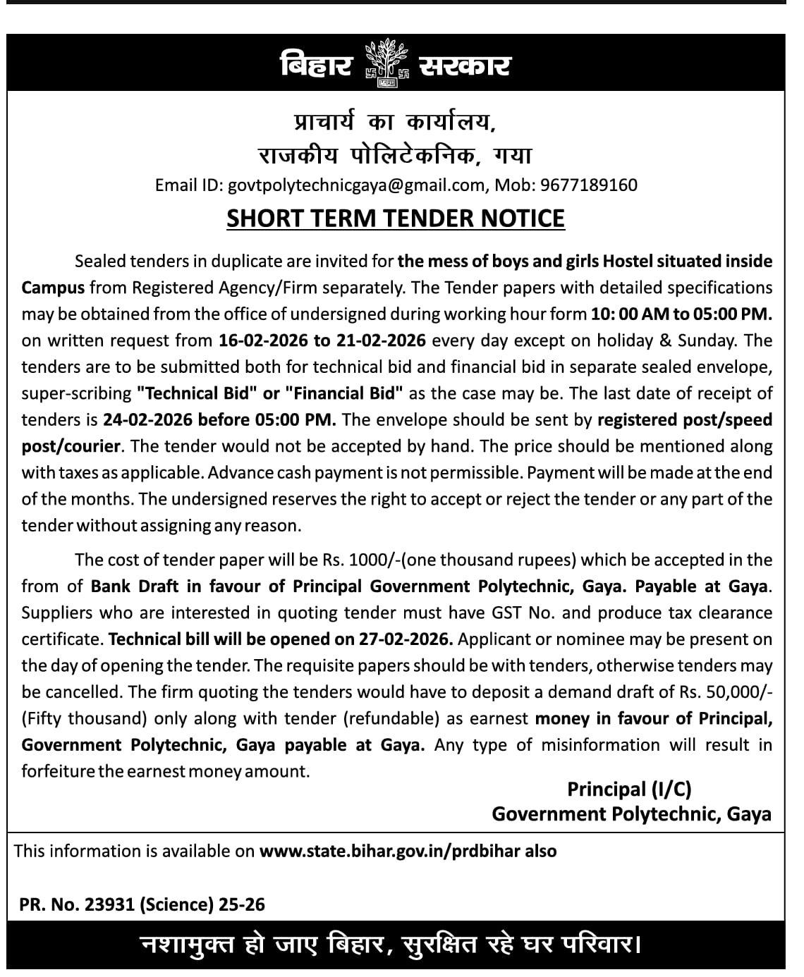 Govt. Polytechnic, Gaya was established by the act of Govt. of Bihar in the year 1960, constituted to work under Department of Science and Technology. Govt. Polytechnic, Gaya is situated at the place of enlightenment of “Lord Gautam Buddha” and is a holy place where foot marks of “Lord Vishnu” is placed in the sacred “Vishnu Pad Mandir”.